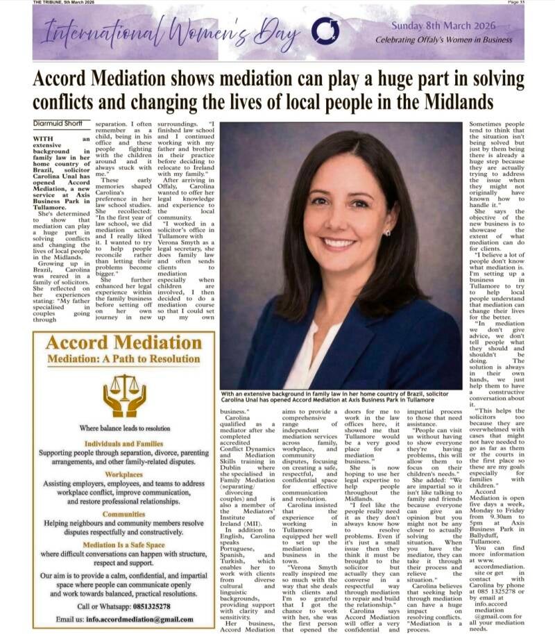 Thank you to the Tullamore & Midlands Tribune for highlighting the growing role of mediation in our region.